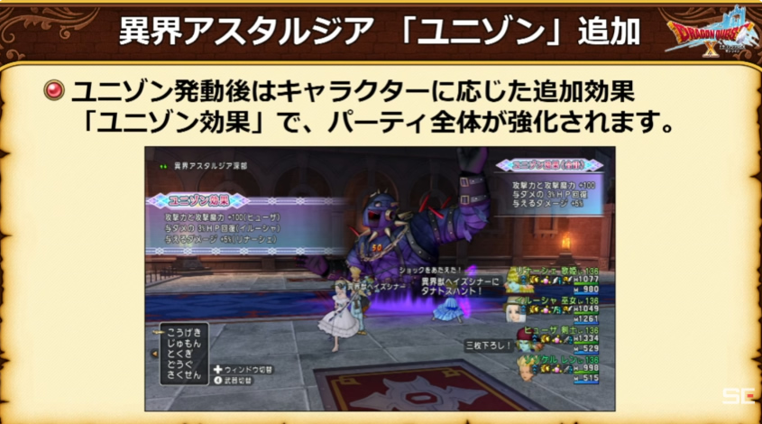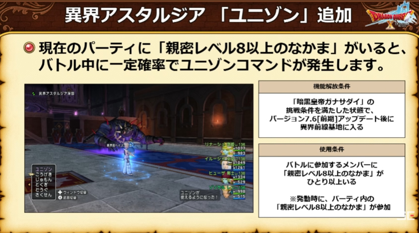 ○「ユニゾン」は仲間と一緒に使用する特殊な技で、「いっせいこうげき」と「回生の陣形」のどちらを使用できます。 ○ユニゾンは仲間がそれぞれ技を使用するだけでなく、特殊なユニゾン効果を受けることもできます。 ○ユニゾンは「パーティに親密レベル8以上のなかまがいる」ことが発動条件となります。