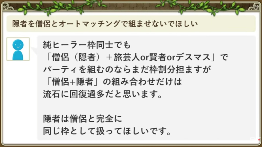 結論から言うと、色んな職業で来てほしいし、色んな職業で楽しんでほしいので、僧侶がいるから隠者は入れないといったことはしたくない。