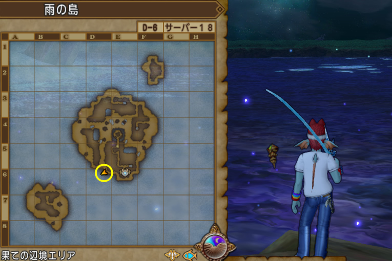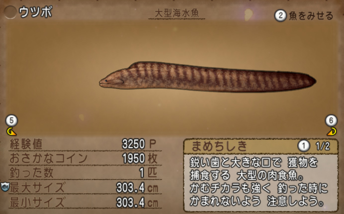 ウツボは雨の島の海で釣ることができます。 ※雨の島へ行くに7.5のストーリーをある程度進める必要があります。 レア度★5なのでヒット率は低めです。 距離も240m程度とそこそこ遠いため、確実に釣り上げるには★3の釣り具で挑みたいところ。